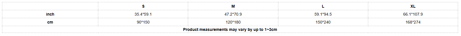 cm | 90*150 | 120*180 | 150*240 | 168*274 |
